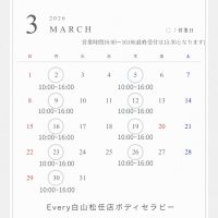 いつもEvery富山掛尾店をご利用頂き誠にありがとうございます。 日頃のご愛顧に感謝の気持ちを込めて、以下の日程で明治安田生命様主催で 「健康測定会(ベジチェック・脳年齢)」を開催します。 皆様のお越しを心よりお待ちして …【白山松任店】 ボディセラピー出張施術 3月開催日のご案内