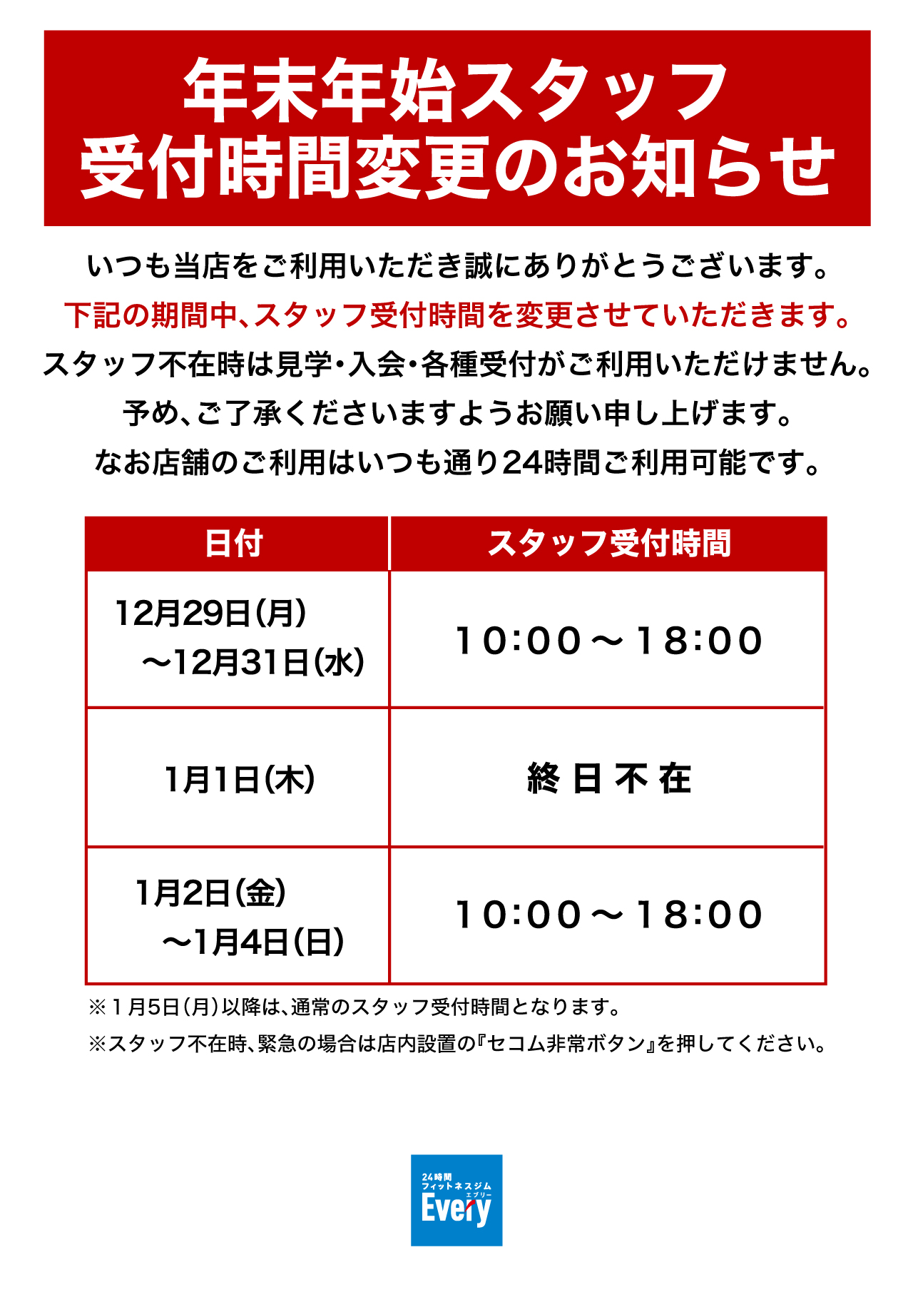 • 年末年始のスタッフ受付時間変更のお知らせ