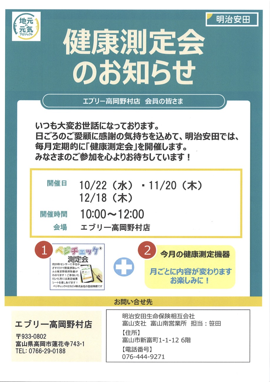 Every高岡野村店では明治安田生命様主催で定期的に健康測定会を開催しております。