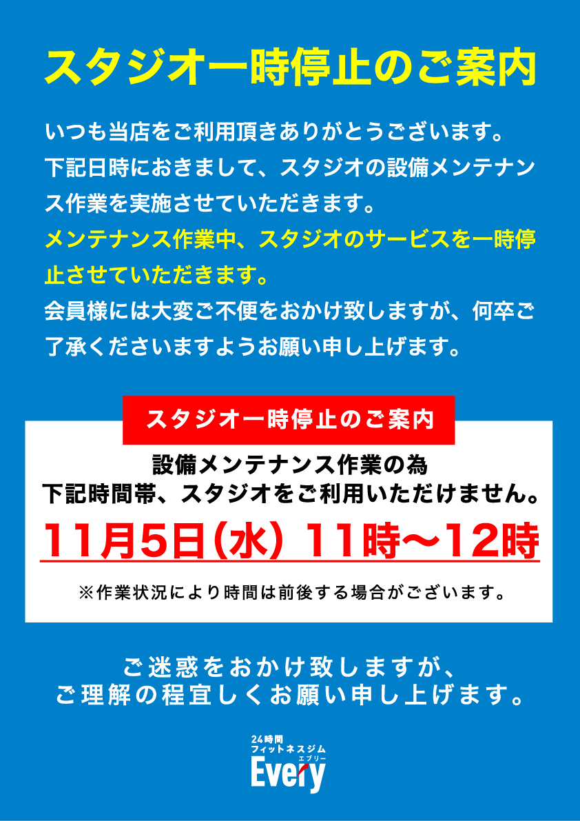 【富山天正寺店】スタジオ一時停止のご案内 | 2025年11月5(水) 11:00~12:00