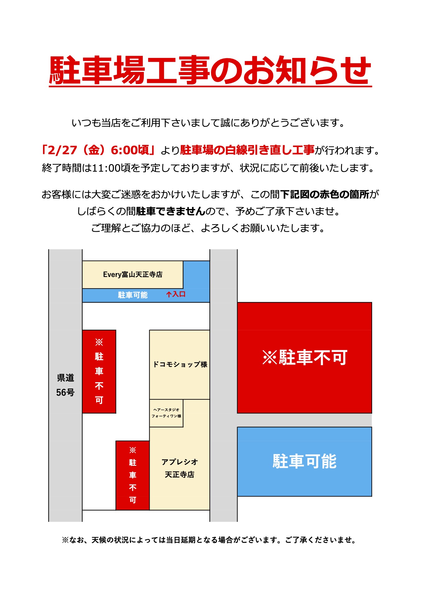 • 【富山天正寺店】駐車場工事のお知らせ | 2026年2月27日(金) 6:00~11:00