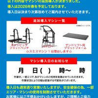 26年春にマシンを追加導入することが決定しました! マシン追加作業時は一部エリア・マシンの利用制限を行います。 ご迷惑をお掛けしますがご理解とご協力をお願い致します。 詳しい日程は決定次第改めてお知らせ致します。【上越藤野新田店】【26年春予定】フリーウェイトエリアの拡張とマシン追加導入のお知らせ